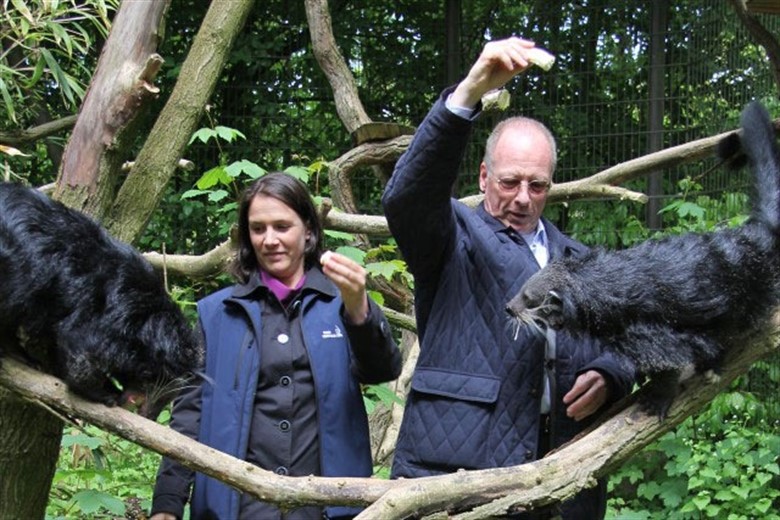 Heute geht er schon mal mit den beiden Binturong-Brüdern Abang und Banu auf Tuchfühlung. „Angst habe ich nicht“, sagt er gelassen, bevor er das Gehege in der Nähe des Veranstaltungsplatzes betritt: „Ich bin auf einem Bauernhof aufgewachsen.“ Als er dann zwischen den beiden Marderbären steht, wird deutlich, dass das Dirigieren seine Profession ist. Nur hat er heute statt seines Taktstockes und eines Orchesters eine Banane und zwei Binturongs, die ihm folgen.