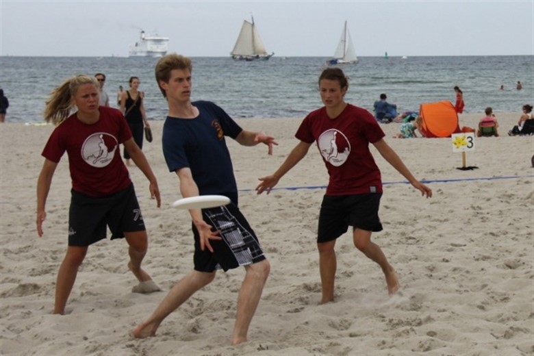 Ultimate-Frisbee-Turnier im nassen Strand von Warnemünde