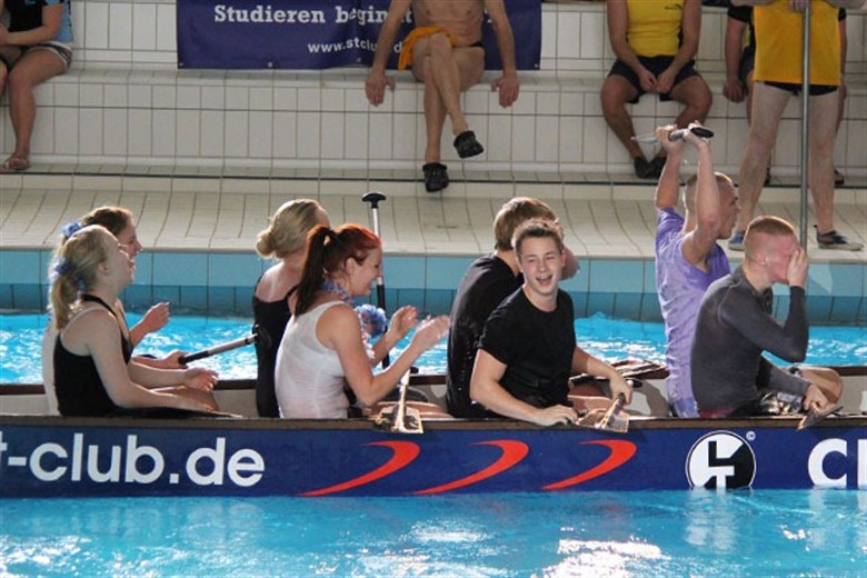 So weit, so gut. Nun sorge man dafür, dass dieses Boot – möglichst ohne personelle Verluste – ziemlich genau den Mittelpunkt des Beckens erreicht. Nicht immer ganz einfach, da sich die beiden Gegner direkt gegenübersitzen und sich die Anspannung während des In-Die-Mitte-Gleitens stetig erhöht. Jedenfalls ist nun der Punkt gekommen, an dem der offizielle Schiedsrichter das Startzeichen gibt, sich alle Paddel ins Wasser bewegen und das Rennen beginnt.