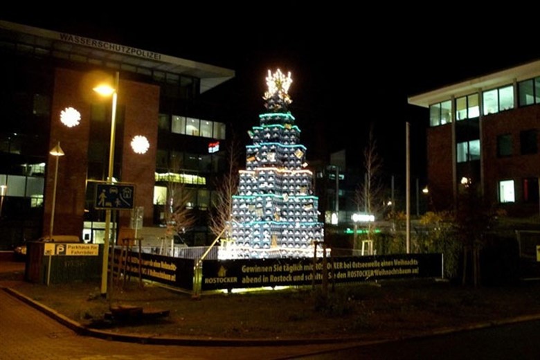 Der ahnungslose Beobachter kann sich hinsichtlich der Adventszeit und der bunten Beleuchtung wohl zusammenreimen, dass es sich hierbei um einen Weihnachtsbaum handeln soll. Das seltsame Gebilde ist etwa 10m hoch und im Prinzip nichts anderes als eine Pyramide aus über 1000 leeren Bierkästen. Rostocker, versteht sich.
