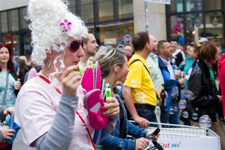 Die wurde auch im Anschluss der Parade bei einem Straßenfest auf dem Neuen Markt gepflegt. Umgeben von zahlreichen Infoständen von Vereinen, Parteien und Unternehmen, die sich ebenfalls am Umzug beteiligten, regten politische Diskussionen und ein Unterhaltungsprogramm auf der Bühne zum Nachdenken und feiern an.