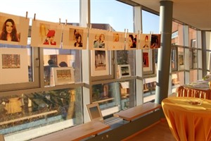 Überhaupt boten sich die Räumlichkeiten sehr für eine Ausstellung an. In drei kleineren Tagungsräumen lagen Bilder aus und wurden Präsentationen über Beamer gezeigt. Im großen Saal hingen die Bilder dann an Seilen von der Decke, was eine sehr bewegte Atmosphäre schuf. Verbunden wurden beide Flächen von einem Flur mit breiter Fensterfront, in dem ebenfalls Bilder ausgestellt wurden. Durch die nachmittägliche Sonne wurde so alles in ein goldenes Licht getaucht.