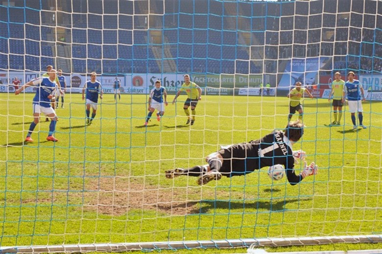 Im direkten Zweikampf legt Schlitte in der 52. Minute Jänicke im Strafraum der Gäste. Den von Freddy Borg fast schon berechenbar flach geschossenen Strafstoß kann Hansa jedoch nicht zum Ausgleich nutzen – Männel kann den Elfmeter problemlos parieren.
