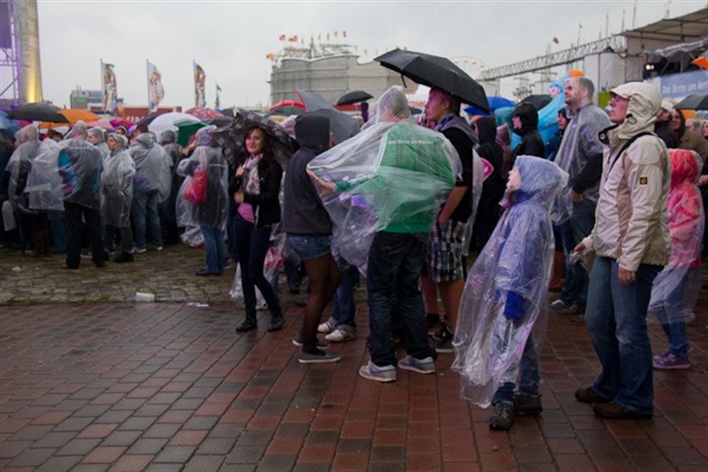 Der Weg zur NDR-Bühne führte gestern Abend an zahllosen Pfützen vorbei. Dort angekommen sorgten die neuen NJOY-Frühstücksmoderatoren Andreas Kulage und Jens Hardeland mit lockeren Sprüchen und der einen oder anderen Showeinlage für sonnige Stimmung beim Publikum. Die Besucher der Hanse Sail waren mit wetterfesten Jacken oder Schirmen gut gegen den immer wieder einsetzenden Regen gerüstet. Und für die, die auf einen lauen Sommerabend gehofft und nichts davon mitgebracht haben, verteilte der NDR Regencapes am Bühnenrand.