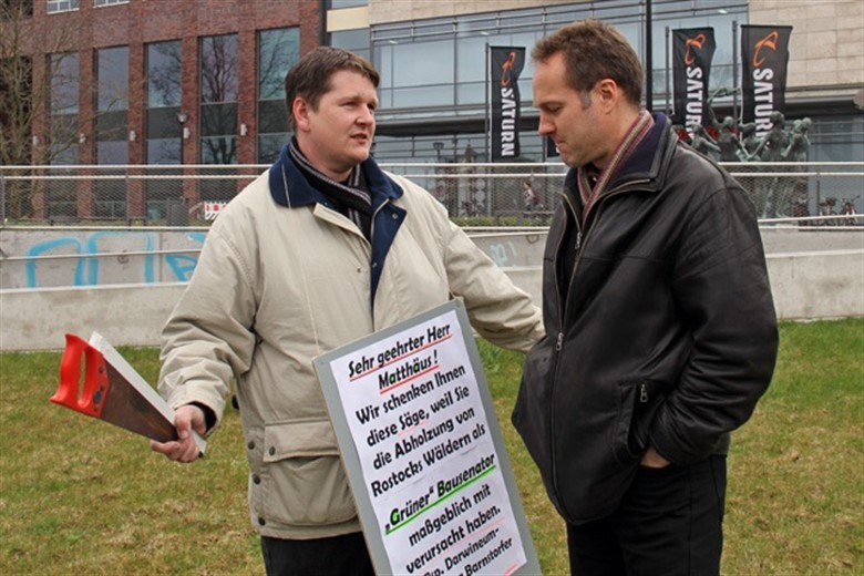„Wir schenken Ihnen diese Säge, weil Sie die Abholzung von Rostocks Wäldern als ‚Grüner‘ Bausenator maßgeblich mit verursacht haben“, gab es auf seinem Transparent zu lesen. Zusammen mit zwei weiteren Aktivisten protestierte er für den Erhalt von Bäumen in der Rostocker City und besonders gegen die Abholzungen für das Darwineum im Barnstorfer Wald.