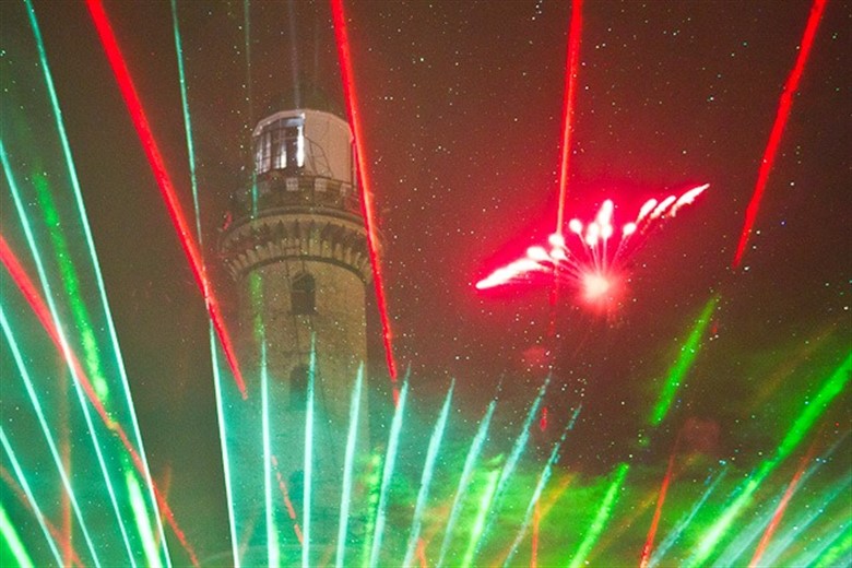 120 Scheinwerfer, sechs Nebelmaschinen und zweieinhalb Kilometer Starkstromkabel hatten die Techniker seit 8 Uhr morgens für „Leuchtturm in Flammen“ auf dem Veranstaltungsgelände rund um den 36,90 Meter hohen Leuchtturm installiert. Um 18 Uhr begann die Show, die in diesem Jahr unter dem romantischen Motto „Für Dich“ stand.