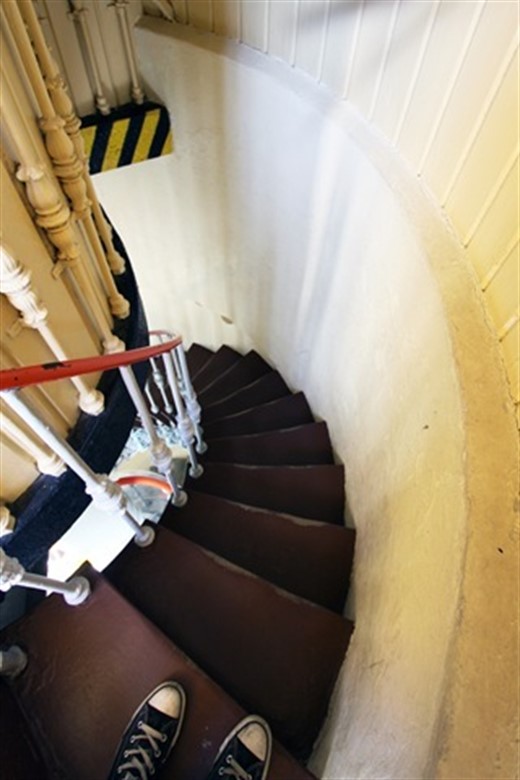 Im schmalen Treppenaufgang des Leuchtturms finden sich überall kleine Informationstafeln, historische Abbildungen, Zeitungsartikel. Berechtigterweise, das Ding ist ja auch schon über 100 Jahre alt. Übrigens hat das Leuchtfeuer eine Reichweite von 16 Seemeilen.