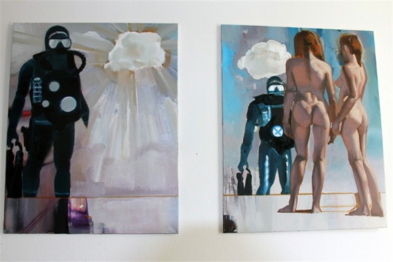 Sein Hauptthema hier in Rostock war „Beinarbeit“. In seinen 10 Jahren als Rückenschwimmer hat er häufig diese Perspektive wahrgenommen und hat sie nun in seinen Bildern verarbeitet. Auch seine Zeit als Kampftaucher ließ er in seine Arbeiten einfließen.