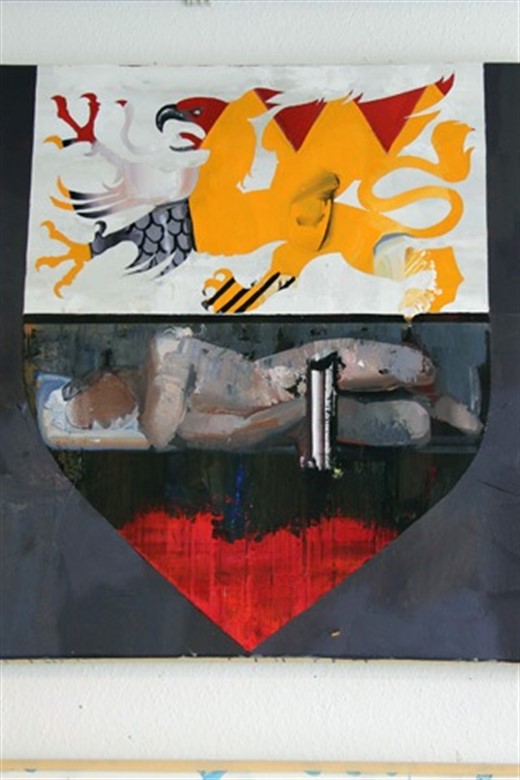 Eines seiner ersten Bilder hier malte der Künstler, der sein Diplom 1997 in Leipzig machte, als Traumfänger. „In den ersten 2 Wochen hatte ich nur Albträume. Dies kam wahrscheinlich vom Altenheim gegenüber, aus dem man nachts um zwei Schreie hören konnte.“ Auf dem Bild ist der Rostocker Greif zu sehen, der sich über einer liegenden Person befindet.