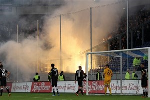 Während das letzte Aufbäumen von Hansa auf sich warten lässt, zünden einige Unbelehrbare wieder einmal Pyrotechnik im Gästeblock und stecken ein geklautes MSV-Banner in Brand. Die dritte Niederlage in Folge ist für die Rostocker indes besiegelt.