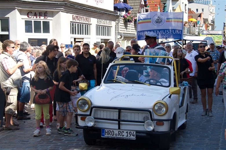 Mit Bonbons, Rosen und Feinkosthäppchen für die Passanten, traditionellen Trachten und bunten Faschings- und Bühnenkostümen sowie mit seinen Spielmanns- und Fanfarenzügen erinnerte der Tross an einen sommerlichen Karneval, aber auch an eine Warnemünder Leistungsschau. Denn nicht nur die Vereine hatten sich herausgeputzt, auch die Unternehmen des Ostseebades präsentierten sich und schickten ihre teilweise riesigen Fahrzeuge durch die engen Gassen. Mit ihrem neuesten und einem Oldtimer Löschfahrzeug schloss sich die Warnemünder Feuerwehr dem Umzug an. Denn neben der Gegenwart gewehrt der Niege Ümgang auch Einblick in die Vergangenheit Warnemündes. Und so haben sich auch in diesem Jahr wieder einige historische Persönlichkeiten unter den Festumzug gemischt.