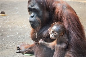 Orang-Utan-Mama Sunda mit ihrem Baby Bayu (Foto: Zoo Rostock/Maria Seemann)