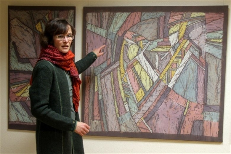 Nach den Einleitungs- und Dankesreden ist die Ausstellung eröffnet und es findet sich Zeit und Gelegenheit zur genaueren Betrachtung der Kunstwerke. Einige davon erscheinen auf den ersten Blick wie gewöhnliche Malereien, entpuppen sich bei genauerem Hinsehen aber als zusammengenähte Collagen aus feinem gefärbten Ziegenpergament.