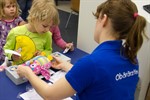 „Wir wollen vermitteln, dass es nicht schlimm ist, wenn man ins Krankenhaus muss. Wir wollen nur das Beste für die Kinder und meist tut es auch nicht weh“, erklärt die Medizinstudentin. Nachdem Lilly bei der Anmeldung ihre Krankenkarte eingelesen hat und schon die ersten wichtigen Daten erfasst wurden, beobachtet sie nun, wie die zukünftige Ärztin ihren Teddy untersucht. Reflexhammer, Stethoskop und Leuchte kommen bei jeder Diagnose zum Einsatz. Die Stofftiereltern dürfen die Geräte auch selbst mal ausprobieren. Freundlich erklären die Ärzte wozu und wie sie angewandt werden. Dann holt Mareike Kreitschik eine Spritze hervor. Karamelli muss geimpft werden. Lilly beobachtet neugierig, wie die Kanüle aufgezogen und an den Arm gesetzt wird. „Ich wurde schon einmal geimpft. Das hat nur ein bisschen gepikst“, erzählt sie aufgeregt und hält den Teddy fest. Klar weiß sie auch, wozu das gut ist: „damit man gesund bleibt und keine komischen Krankheiten bekommt.“