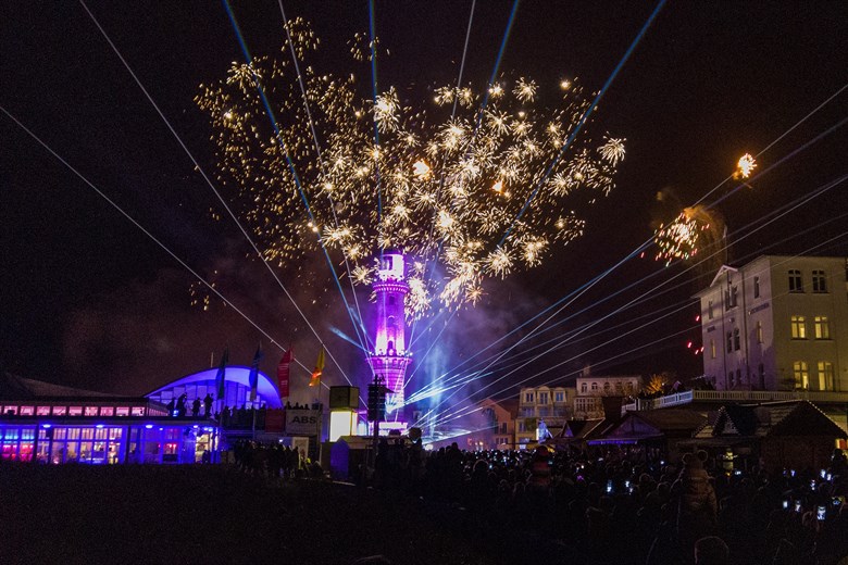 Feuerwerk, Lasershow und Live-Musik – mit der 21. Neujahrsinszenierung des Warnemünder Turmleuchtens startete das Rostocker Seebad heute ins neue Jahr