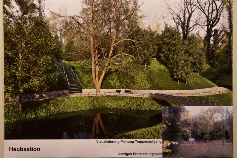 Eine neue Stahltreppe, die im Hang der Heubastion verankert wird, ist geplant. Unter ihr kann Grün wachsen. Die benachbarte Fernwärmeleitung soll unter die Erde verschwinden. Der Balkon der Heubastion kommt weg. Die ursprüngliche Böschung soll an dieser Stelle wieder hergestellt werden. Der obere Bereich wird mit neuen Bänken, Staudenpflanzen und Gräsern umgestaltet, als Reminiszenz an die „Heu“- Bastion. Die bis zu zwölf Meter großen Höhenunterschiede – eine landesweite Besonderheit bei ehemaligen Stadtbefestigungsanlagen – sollen wieder wahrnehmbar werden.