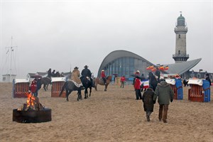 Winterreiten am Strand von Warnemünde13.30 – 14.00 UhrUmzug der Reiter vom Wendehammer am Leuchtturm durch Warnemünde und zurück zum Strandblock 1 (Alter Strom, Kirchenstraße, um Kirchenplatz und zurück)