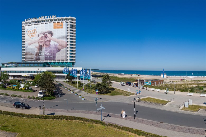 Bildgewaltig startete die Kampagne heute in Warnemünde. Ein 40×40 Meter großes Megabanner wurde am Vormittag an der Fassade des Neptun-Hotels eingeweiht. Über dem Leitspruch „Sei dabei. Zeig Herz. #wirsindurlaubsland“ formt ein junges „Paar“ mit seinen Händen ein Herz. Bereits während des Corona-Lockdowns hatten zahlreiche Hotels Herz gezeigt.
